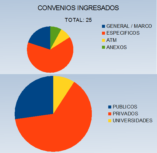 Actualmente hay 39 Convenios Marcos Pasantías vigentes, 6 firmados en este período y 19 Convenios Marcos de Prácticas, 7 correspondientes a este período. Dentro de los convenios hay 51 pasantes y 27 practicantes en actividad.